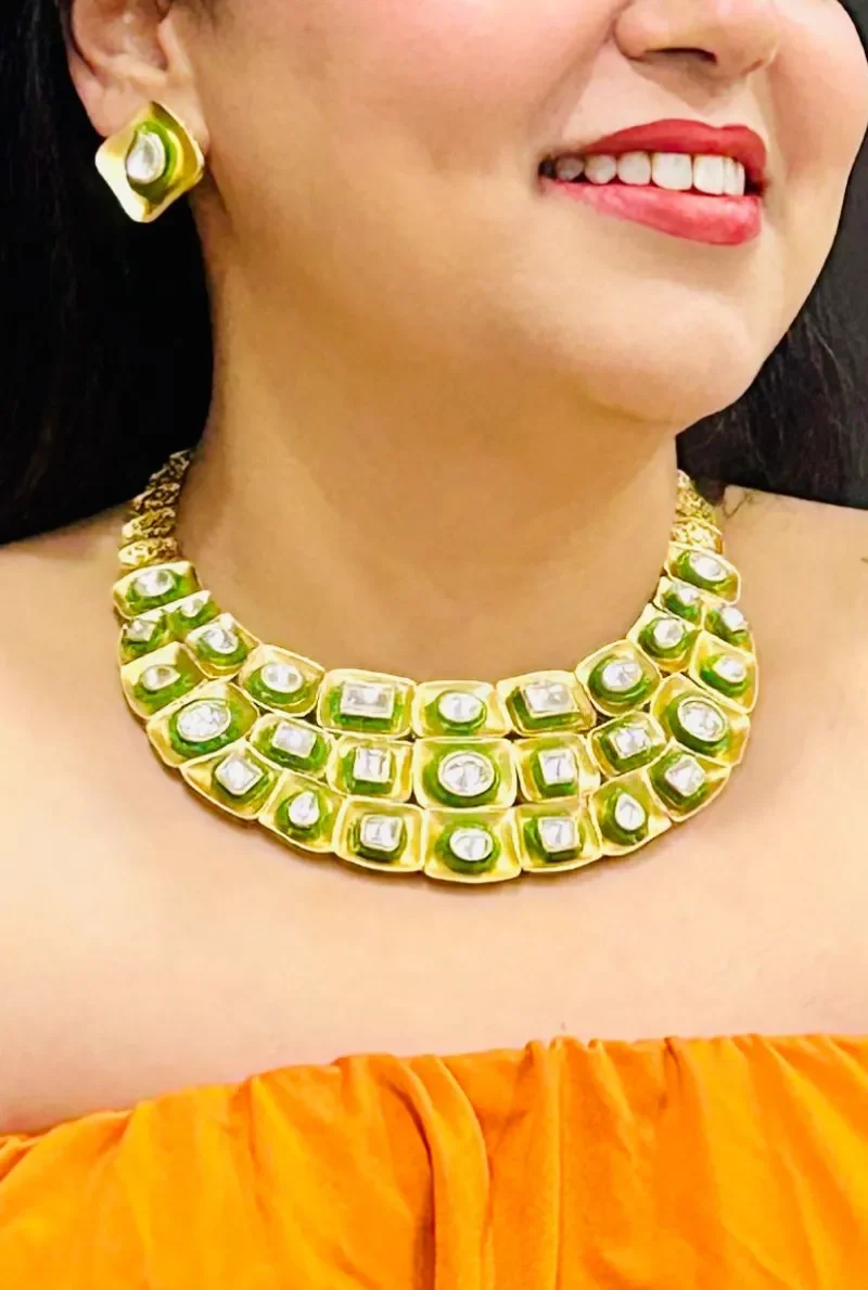 14k Gold Plated Golden Green Polki Necklace With Earrings